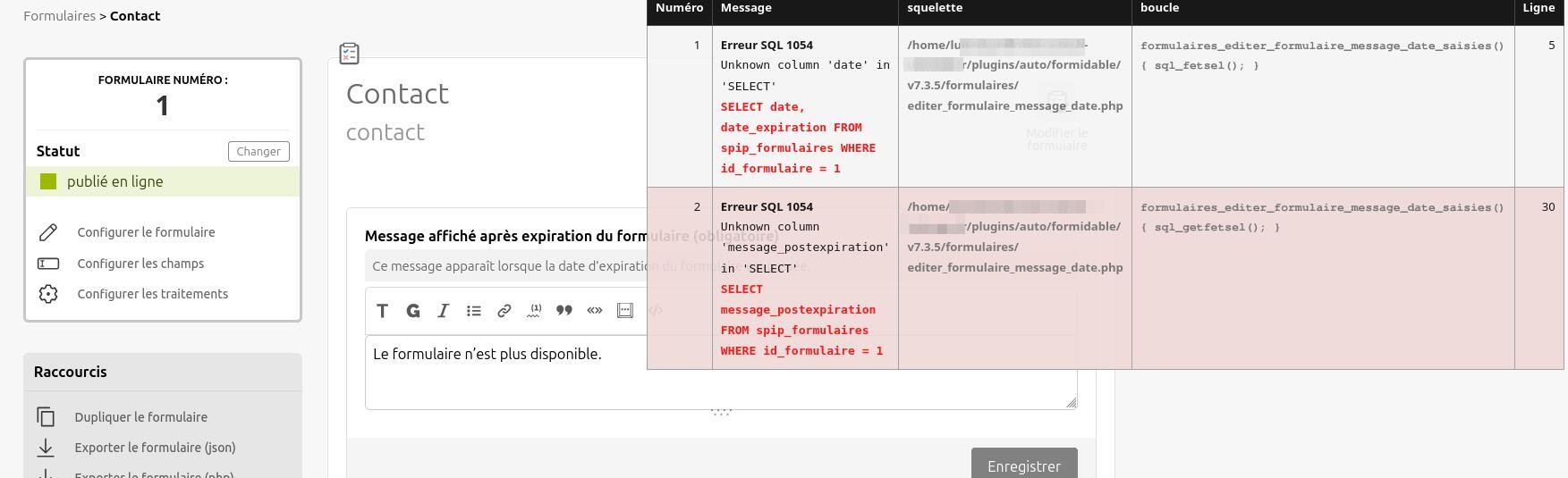 alors là on va peut-être comprendre un peu mieux d’où ça vient et possiblement solutionner MON pb mais sans doute pas celui de la communauté ... car j’ai ce même site français de secours installé celui-là tout à fait sur un autre hébergement, avec toutes les mises à jours 4.4.9 et plugin formidable 7.3.5 qui lui non plus ne présente pas ce message d’erreur au clic sur l’URL du formulaire dans l’espace privé.