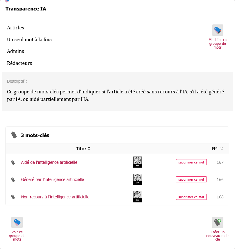Lors de l’activation du plugin, le groupe de mots-clés “Transparence IA” est créé et 3 mots-clés y sont placés :